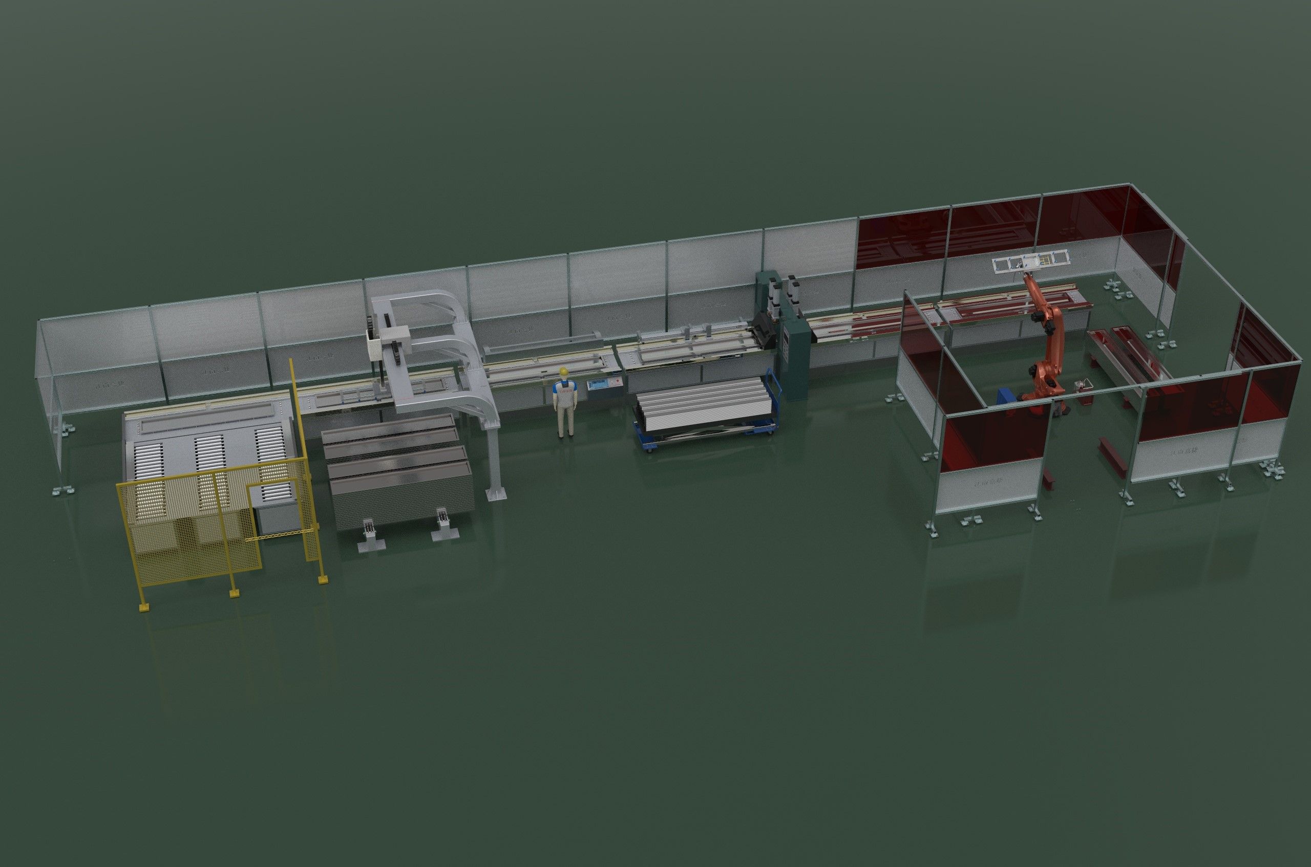5、焊機及成品下料區(qū): 通過設(shè)備進(jìn)行自動焊接,焊接高度小于門板鐵皮高度,當(dāng)焊接完成后,機器人工位自動翻轉(zhuǎn),使用吸盤進(jìn)行自動取下,按預(yù)定軌跡進(jìn)行堆放,當(dāng)一個成品料堆,堆放達(dá)到指定要求時,系統(tǒng)給予提示,并自動選擇另一個堆放平臺進(jìn)行下料,保證下料料堆更換線體不停機。機器人選用庫卡 KR210R2700EXTRA。